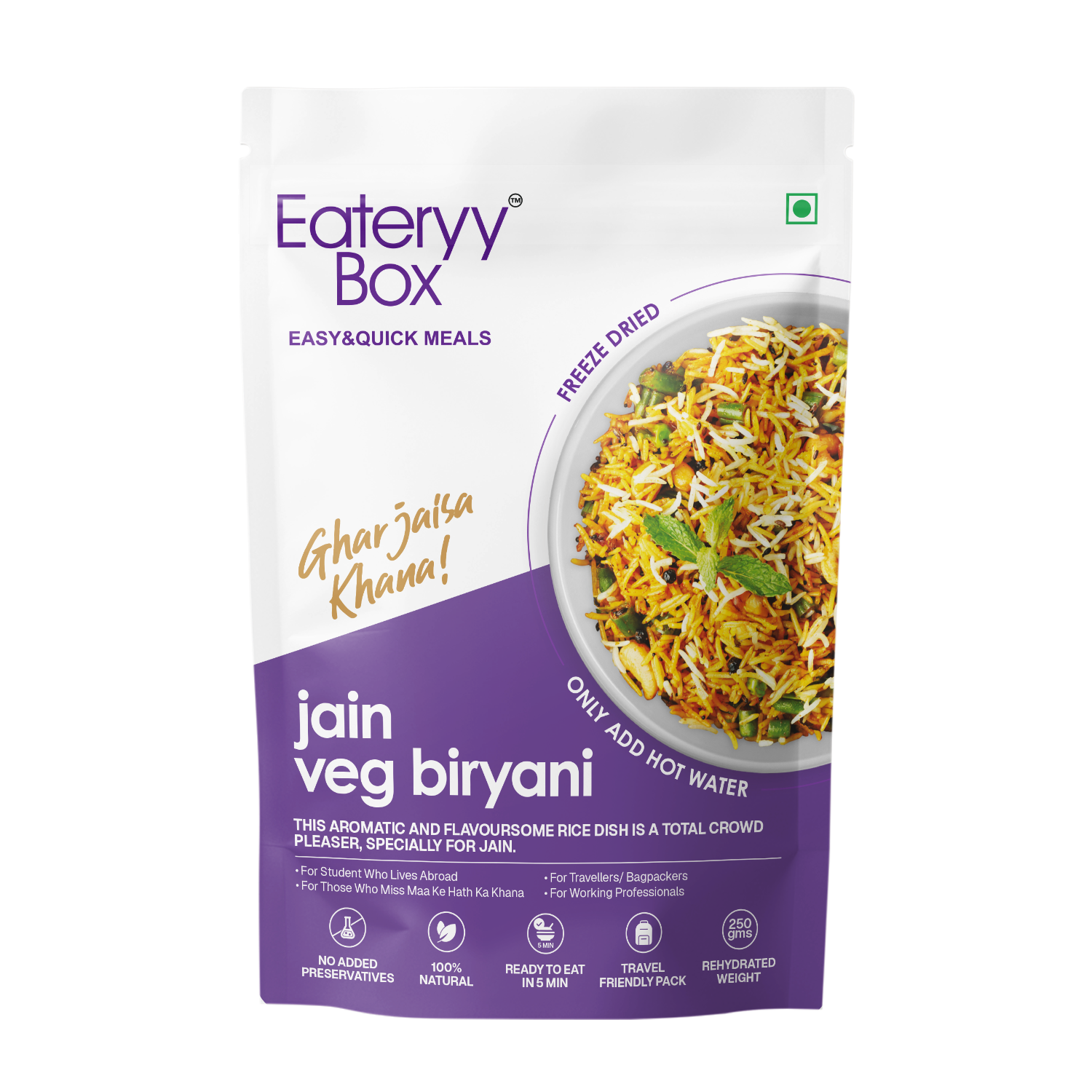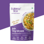 EATERYY BOX Jain Veg Biryani delivers the rich essence of traditional biryani without onion or garlic, making it ideal for those following Jain dietary guidelines. This instant meal combines fragrant basmati rice with wholesome vegetables like French beans, peas, capsicum, and tomatoes, all seasoned with authentic Indian spices.