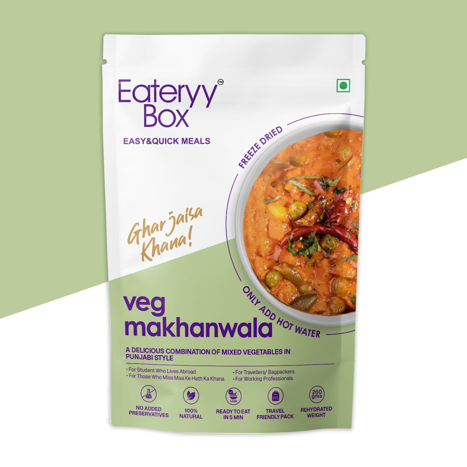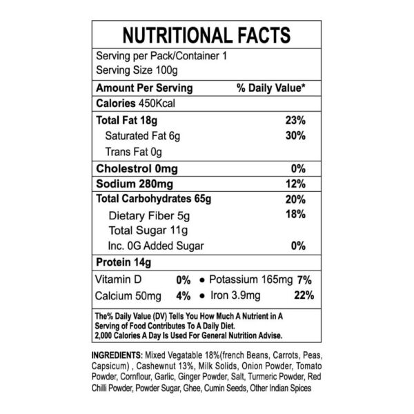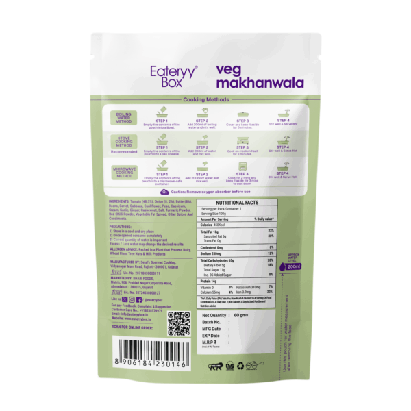 EATERYY BOX Veg Makhanwala offers the warmth of homemade Punjabi cuisine while respecting Jain dietary values. This 100% vegetarian, no-onion, no-garlic recipe uses handpicked vegetables like beans, cauliflower, and peas—seasoned with aromatic spices to deliver full flavor in a quick, ready-to-eat format. Just heat and serve for a delicious, wholesome meal wherever you are.